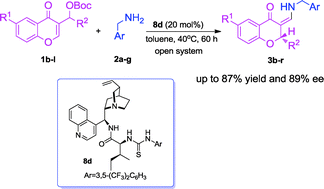 Zhong, N.-j.; Liu, L.; Wang, D.; Chen, Y.-J., Enantioselective tandem reaction of chromone-derived Morita-Baylis-Hillman carbonates with benzylamines catalyzed by a trifunctional organocatalyst: the synthesis of chiral 3-aminomethylene-flavanones. Chem. Commun. 2013, 49, 3697-3699.