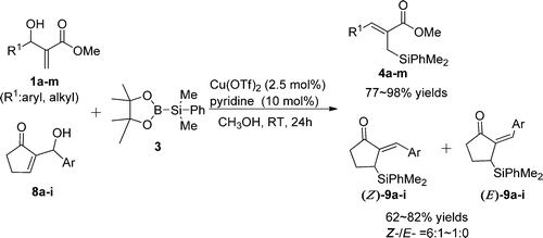 Xuan, Q.-Q.; Zhong, N.-J.; Ren, C.-L.; Liu, L.; Wang, D.; Chen, Y.-J.; Li, C.-J., Cu(II)-Catalyzed Allylic Silylation of Morita–Baylis–Hillman Alcohols via Dual Activation of Si–B Bond and Hydroxyl Group. J. Org. Chem. 2013, 78 (21), 11076-11081.