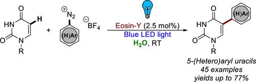 Liu, A.-D.; Wang, Z.-L.; Liu, L.; Cheng, L.* "An aqueous and visible-light promoted C-H (hetero)arylation of uracil derivatives with diazoniums", J. Org. Chem. 2021, 86, 16434–16447.